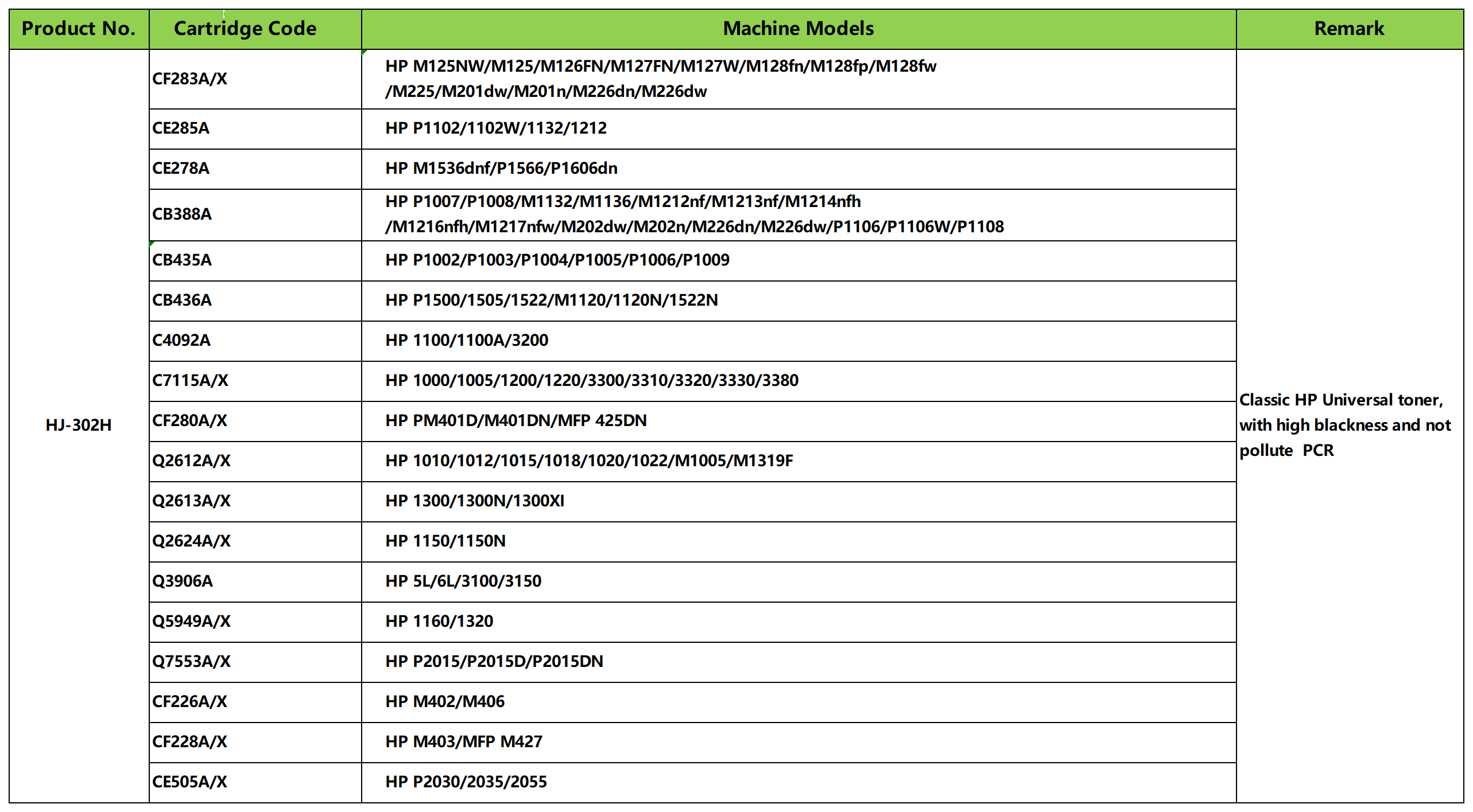 Pauka TONER SGT Classic HP Universal toner HJ-302H CB435 /CE278/Q2612/Q5949/CE505 etc. me ka ʻeleʻele kiʻekiʻe a ʻaʻole hoʻohaumia i ka PCR